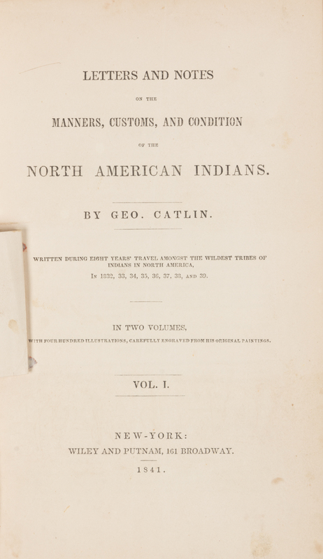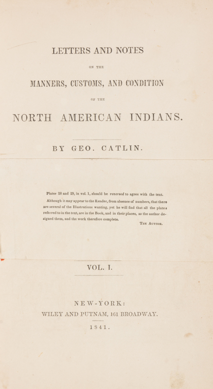 Letters and Notes on the Manners, Customs, and Conditions of the North American Indians. New York: Wiley and Putnam, 1841.2 volumes, 8vo (239 x 154 mm). Frontispiece, folding map, numerous illustrations, errata tipped in vol.I. (Light dampstain to upper margin of a few leaves vol.II, a few pale spots, tears to folds of map.) Modern brown cloth (some wear to hinges). FIRST EDITION, second issue with "Zedikiah" for "Frederick" on p.104, and with inconsistent plate numbering, as usual ("Though it may appear to the Reader, from absence of numbers, that there are several of the Illustrations wanting, yet he will find that all the plates are referred to in the text"). Sabin 11536.