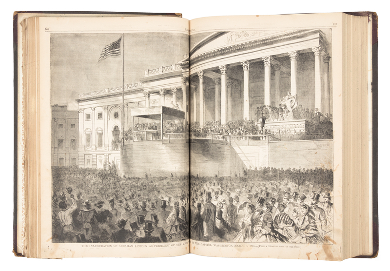 Harper's Weekly. A Journal of Civilization. Volumes V-IX, Nos. 210-470. New York: 1861-1865.5 volumes. Folio (396 x 278 mm). Numerous wood-engraved illustrations and maps, some full page, many by Winslow Homer, advertisements. (Lacking front leaf only from nos. 365, 367, 210, and 256, A few tears, some affecting text or illustrations, minor spotting throughout.) 20th-Century half morocco (rubbed, hinges reinforced, a few joints separated, a few spines chipping).A NEARLY COMPLETE RUN from January 1861 to December 1865, covering the entire Civil War. From its founding in 1857 until 1861, Harper's Weekly upheld a modest editorial stance on slavery and related issues of the time, as it had a considerable readership in the South, and wanted to maintain the Union at all costs. Once the war came, it threw its full support to Abraham Lincoln and the Union. Harper's was one of the most widely-read newspapers of its time and both its news and illustrations kept soldiers and their families up to date on details of the war.