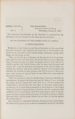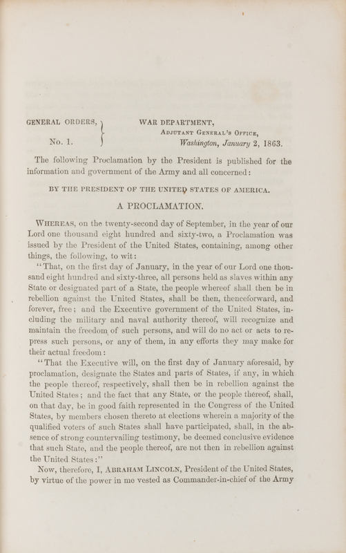 General Orders Affecting the Volunteer Force. Adjutant General's Office. 1863. Washington D.C.: Government Printing Office, 1864.12mo (182 x 122 mm). Letterpress folding table. Original cloth (some light toning or wear, otherwise fine). A FINE COPY INCLUDING AN EARLY PRINTING OF THE EMANCIPATION PROCLAMATION, as well as 400 other General Orders issued in 1863. Provenence: Capt. S. Hine?, H Co., 101st U.S. C. Inf. (signature).
