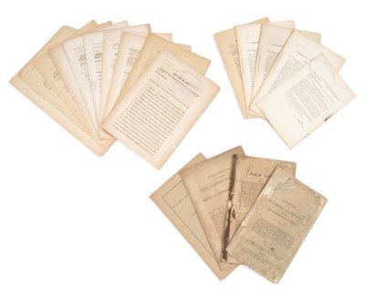 A group of 32 sheets on the Confederacy, with a slavery document, comprising: House of Representatives, February 25, 1865...A Bill to Provide Means to pay the Army and Navy, and carry on the War. [Richmond], 1865. - House of Representatives, January 10, 1865... Message of the President. [Richmond], 1865. - Adjunct and Inspector General's Office, February 6, 1865. General Orders, No. 3... An Act to Provide for the Appointment of a General in Chief of the Armies of the Confederate States. Richmond, n.p., 1865. - And 30 others. Together, 33 sheets, each with oval ink stamp of "Record Division, Rebel Archives, War Department" on upper portions of most pages, condition generally fine, complete list available upon request.