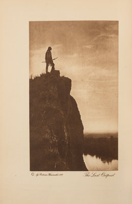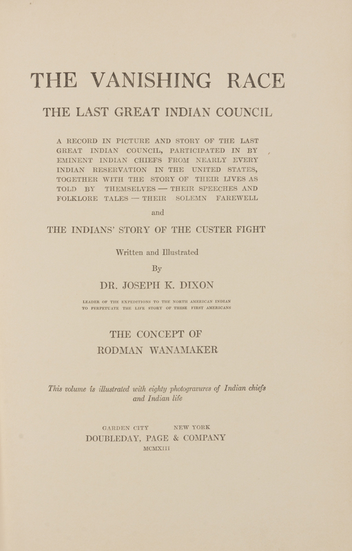 The Vanishing Race: The Last Great Indian Council. Garden City and New York: Doubleday, Page & Company, 1913. 8vo. Sepia photogravue frontispiece, numerous sepia photogravure plates after photographs by Rodman Wannemaker. Publisher's brown pictorial cloth (upper hinge broken, spine ends with light wear.) FIRST EDITION, published to commemorate the groundbreaking of the National American Indian Memorial, intended to overlook the Narrows at the entrance of New York Harbor, which was never completed.