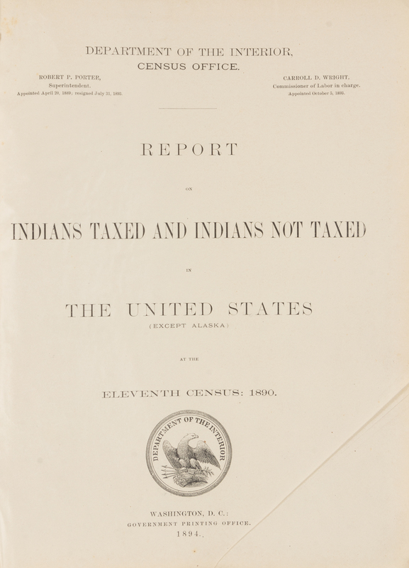 Report on Indians Taxed and Indians not Taxed in the United States (except Alaska) at the Eleventh Census: 1890. Washington: Government Printing Office, 1894.4to (289 x 233 mm). Numerous plates comprising chromolithographic, lithographic, and photographic plates, numerous lithographic maps (a few folding). (Small stain in upper margin, a folding map loose.) Publisher's black cloth (some light overall wear, shaken as usual, hinges loose.) A comprehensive compilation of information known about the remaining Native Americans at the end of the 19th century. The maps show the distribution of tribes, and the work is profusely illustrated with portraits, diagrams and tables. The report was issued by the Census Office at the Department of Interior by Robert P. Porter, the Superintendent, and Carroll D. Wright, the Commissioner of Labor.