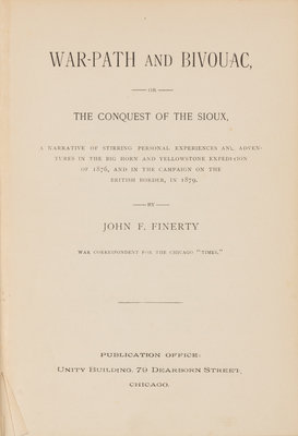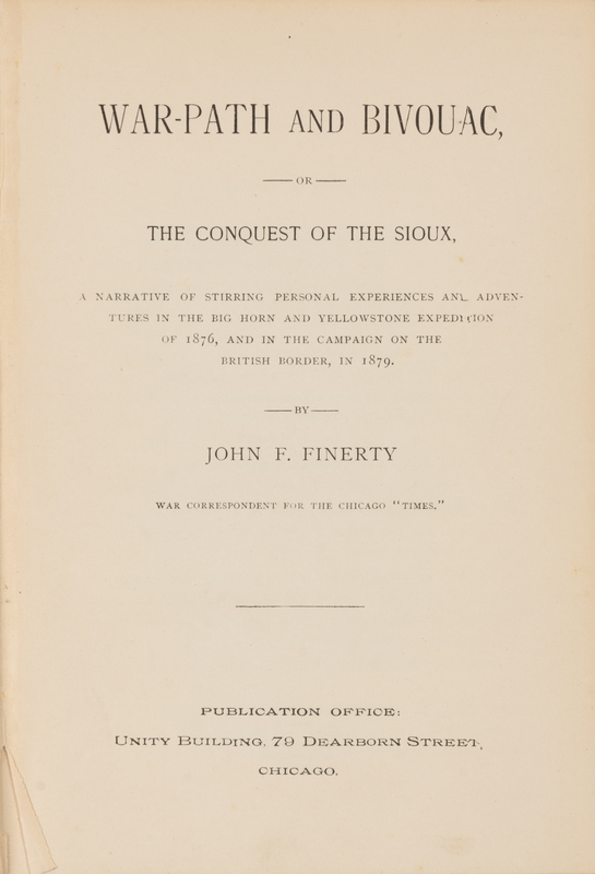 War-path and Bivouac, or, The Conquest of the Sioux. Chicago: [Donohue & Henneberry], 1890.8vo. Folding map, numerous illustrations. Publisher's blue pictorial cloth, edges marbled (lightly rubbed, hinges loose). FIRST EDITION, describing Finerty's experiences during the Big Horn and Yellowstone expedition of 1876, and during other post-Civil War battles, with a folding map depictng Sioux territory.