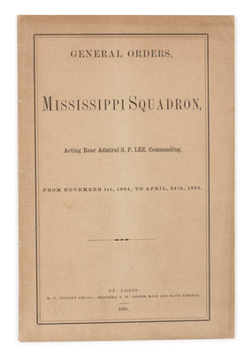 General Orders, Mississippi Squadron, Acting Rear Admiral S.P. Lee, Commanding, from November 1st, 1864, to April, 24th, 1865. St. Louis: R.P. Studley and Co., 1865. 8vo (191 x 126 mm). 52pp. ORIGINAL WRAPPERS. Comprising 52 general orders and 8 special orders, regarding the loss of records in the burning of the Flag Ship Black Hawk, sentences for prisoners, the discharge of minors, and payroll. The Mississippi River Squadron operated on the western rivers during the Civil War; it was originally established as part of the Union Army, but transferred to the Union Navy in 1862.