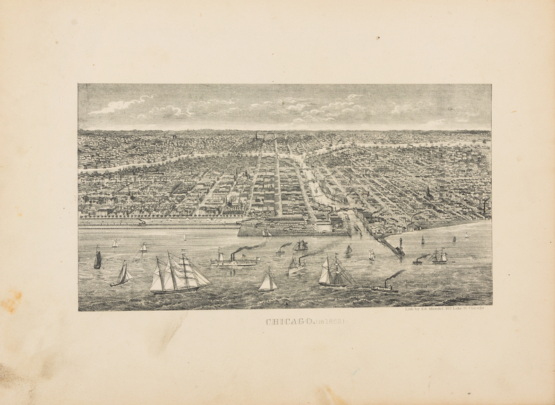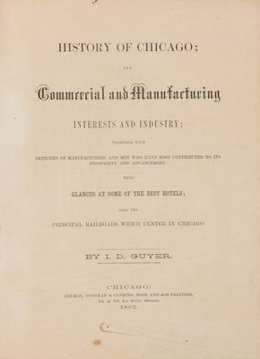 History of Chicago: its Commercial and Manufacturing interests and industry; together with sketches of manufacturers and men who have most contributed to its prosperity and advancement. Chicago: Church, Goodman & Cushing, 1862. 4to (262 x 196 mm). 4 (of 5) lithographic plates, numerous woodcut illustrations. (Some light spotting, last leaf torn, lacking one chromolithographic plate.) Publisher's green gold-stamped cloth (cloth tape rebacking, upper hinge broken, a few leaves becoming loose). FIRST EDITION, with lithographic views of Chicago, including one chromolithographic plate of the Lill & Diversys Chicago Brewery. RARE at auction. Howes G-468; Sabin 29364.