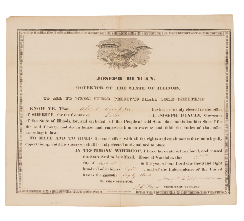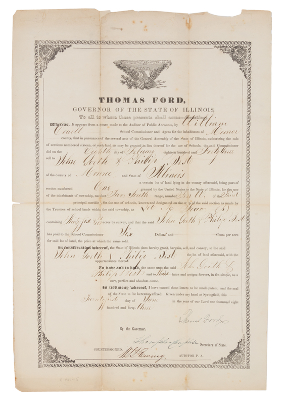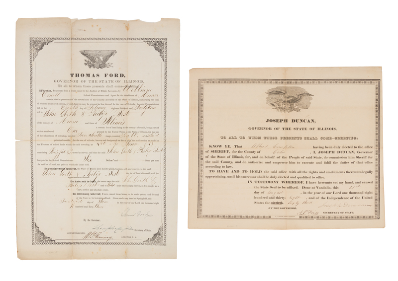 Two printed documents signed by Illinois Governors, comprising: FORD, Thomas (1800-1850). Document signed, 21 June 1843. Deed of sale for 35 acres in Monroe County Illinois to John Goeth and Philip Best. - DUNCAN, Joseph (1794-1844). Document signed, 21 August 1838. Appointment of Albert Compton as Sheriff of Coles County.