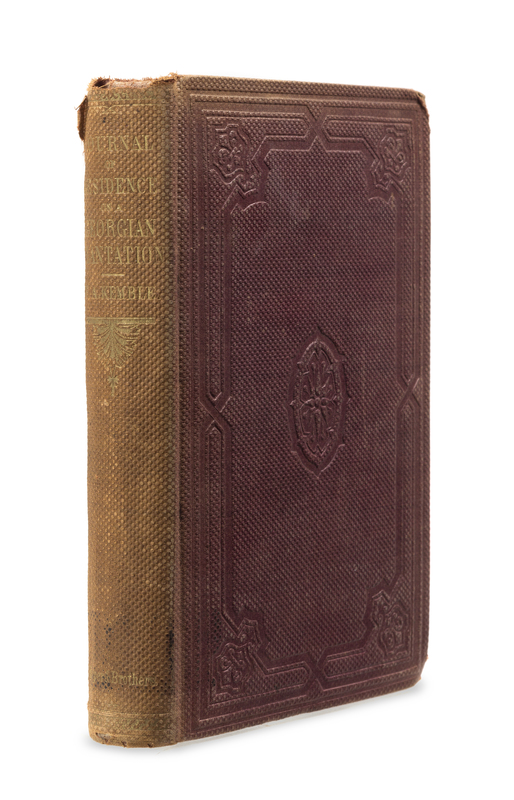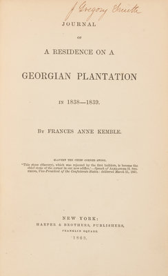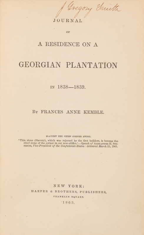 Journal of a Residence on a Georgian Plantation in 1838-1839. New York: Harper and Brothers, 1863.8vo. 10pp. advertisements. Publisher's brown cloth (hinges starting, some light wear to spine ends). FIRST AMERICAN EDITION, FIRST ISSUE, with the ads and word "about" repeated on p.314, line 6. Kemble, a British actress, married Pierce Mease Butler, a plantation owner in Georgia; they lived on his plantations in the winters of 1838 and 1839. Kemble kept a diary of her observations, which was passed around abolitionist circles prior to its 1863 publication during the Civil War. Howes K-70.