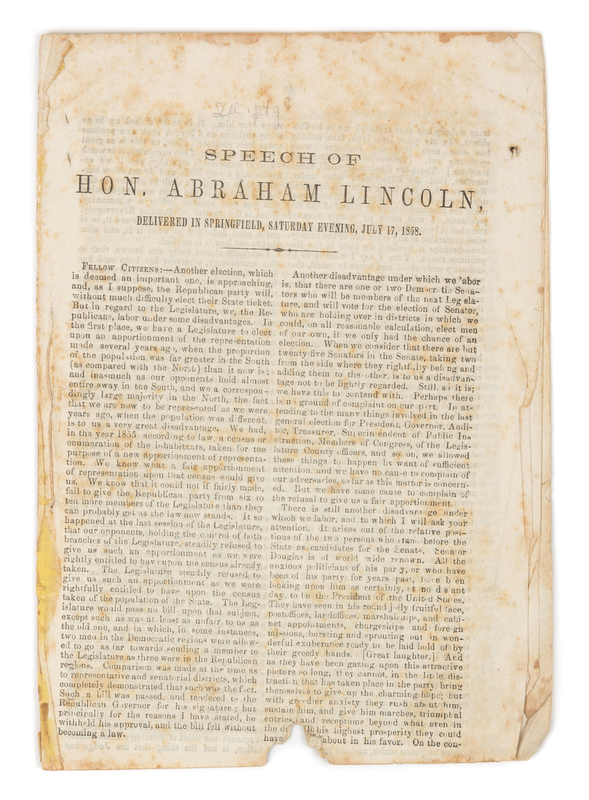 Speech of Hon. Abraham Lincoln, Delivered in Springfield, Saturday Evening, July 17, 1858. [Springfield, IL?: n.p., ca 1858]. 8vo (224 x 158 mm). (A few pale stains, small tear with loss to bottom affecting approximately 2 lines.) Stab-sewn, uncut. FIRST EDITION - A PRELUDE TO THE LINCOLN-DOUGLAS DEBATES. Lincoln discusses the Dred Scott decision, the Lecompton Constitution, and reiterates that "a house divided against itself can not stand" (p.5), defending his famous "House Divided" speech against Douglas' misinterpretation. Monaghan 12.[Bound with:] Great Speech of Senator Trumbull, on the Issues of the Day. Delivered in Chicago, Saturday, August 7, 1858. N.p.: n.p., [1858]. 10pp.