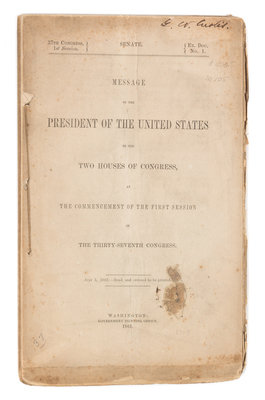 Message of the President of the United States to the Two Houses of Congress, at the Commencement of the First Session of the Thirty-Seventh Congress. July 5, 1861. 37th Congress. 1st Session. Ex. Doc. No.1. Washington, D.C.: Government Printing Office, 1861.8vo (250 x 154 mm). 111pp. (Some light overall browning.) Includes Lincoln's message dated and sent to Congress on July 4, 1861 (but read on July 5, 1861) in which he outlines the events that ignited the war, shares his view on the role of the government, and presents his rationale in defense of the Union. AN INTRIGUING ASSOCIATION COPY: George Curtis, a noted orator, delivered his "Doctrine of Liberty" address to the Phi Beta Kappa society at Harvard in 1862 on behalf of President Lincoln encouraging support of the Emancipation Proclamation. In 1863, he became the political editor at Harper's Weekly. Monaghan 105.