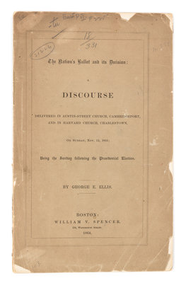 The Nation's Ballot and its Decision: a Discourse Delivered in Austin-Street Church, Cambridgeport, and in Harvard Church, Charlestown, on Sunday, Nov. 13, 1864; Being the Sunday following the Presidental Election. Boston: William V. Spencer, 1864. 8vo (232 x 144 mm). 18pp. Original wrappers (lower wrapper detached, light chipping). Ellis, a Unitarian clergyman, relates casting ballots in the 1864 election to the casting of lots (Acts I: 24, 26). "There is a significance, a moral of intelligible character, in the result of that huge ballot" (p.6). RARE. Monaghan 294; see Sabin 22309. [With:]Mr. Lincoln's Arbitrary Arrests, The Acts which the Baltimore Platform Approves. [New York: n.p., 1864]. 8vo (220 x 148 mm). 18pp. Disbound. Campaign pamphlet for the Baltimore [Repbulican] Platform, which presented Lincoln as their canditate for the 1864 election; "The Baltimore platform..approves all he has done, specifically commending all his course." Monaghan 325; Sabin 41216.