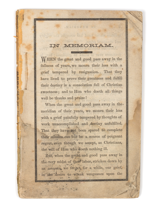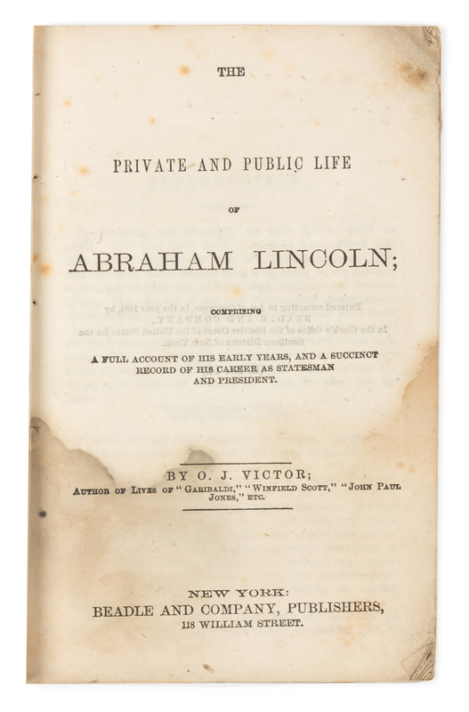 The Private and Public Life of Abraham Lincoln. New York: Beadle & Adams, 1864. 12mo (160 x 102 mm). 4pp. "In Memoriam" printed within mourning borders, engraved frontispiece. Stab sewn, remnant of original wrapper on spine (lacking wrappers). "Early appreciation of the 'few words at Gettysburg' here quoted among the events of 1863 with the comment: 'President Lincoln delivered the following beautiful address'" (Eberstadt). Eberstadt 133:607; Monaghan 363.
