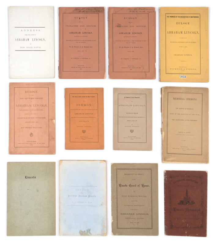 A group of 13 works on Lincoln commemorations and eulogies, comprising: FAY, H.W. Abraham Lincoln and His Last Resting Place. A Leaflet Published for Distribution at the National Lincoln Monument in the City of Springfield, Illinois. n.p.:n.p., n.d. Inscribed by Fay. - GARFIELD, James A. Remarks of Hon. James A. Garfield, in the House of Representatives, April 14, 1866, on the First Death of Abraham Lincoln. Washington, D.C.: Hudson Taylor, 1866. - SUMNER, Charles. The Promises of the Declaration of Independence. Eulogy on Abraham Lincoln, Delivered before the Municipal Authorities of the City of Boston, June 1, 1865. Boston: Ticknor and Fields, 1865. - WILLIAMS, Thomas. Eulogy on the Life and Public Services of Abraham Lincoln, Late President of the United States... Pittsburgh: W.S. Haven, 1865. Including an Autographed Letter Signed by the author. - WOODBURY, Augustus. A Sketch of the Character of Abraham Lincoln: A Discourse Preached in the Westminster Church, Providence, R.I., Thursday, June 1, 1865. Providence: Sidney S. Rider and Brother, 1865. - With 8 others, complete list available upon request.