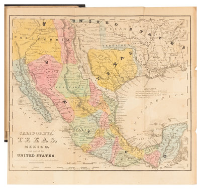 The Life, Travels and Opinions of Benjamin Lundy, including his journeys to Texas and Mexico; with a sketch of cotemporary [sic] events, and a notice of the revolution in Hayti. Philadelphia: William D. Parrish, 1847. 8vo (187 x 113 mm). Engraved frontispiece, engraved hand-colored folding map. (Some spotting or offsetting as usual, short pencil notations on verso of map.) Modern cloth (lettered portion of original spine laid in.) FIRST EDITION, "embodying first-hand information relative to the republic in the earliest stages of its settlement by the Americans. The text is from Lundy's manuscript, and includes: 'Narrative of a trip to Texas in 1830; Journey to new Orleans and Texas in 1833; Journey from Brazoria to Austin; Tours of Observation through San Antonio, Bexar, Monclova, via the Rio Grande and Santa Rosa; From Laredo to San Patricia and Arkansas Bay; Journey to the Matamoras and residence there" (Eberstadt). Eberstadt 123:123; Howes E-10; Sabin 42693.