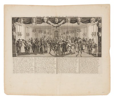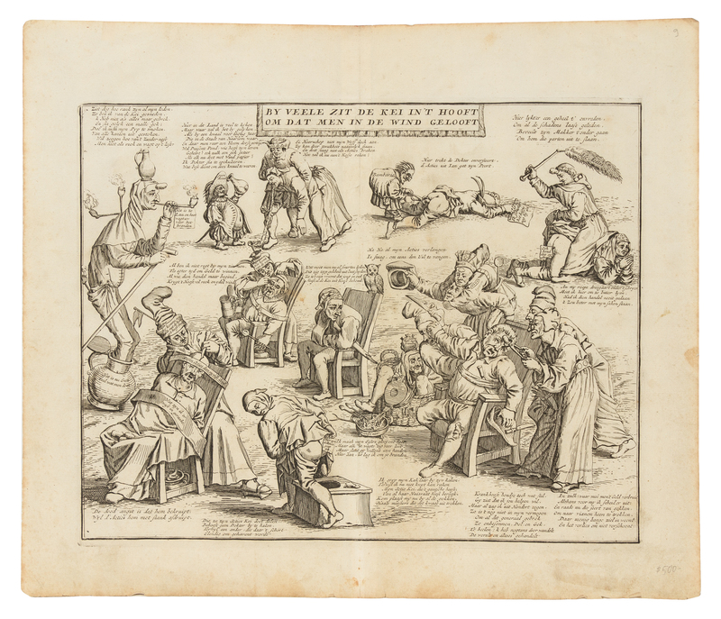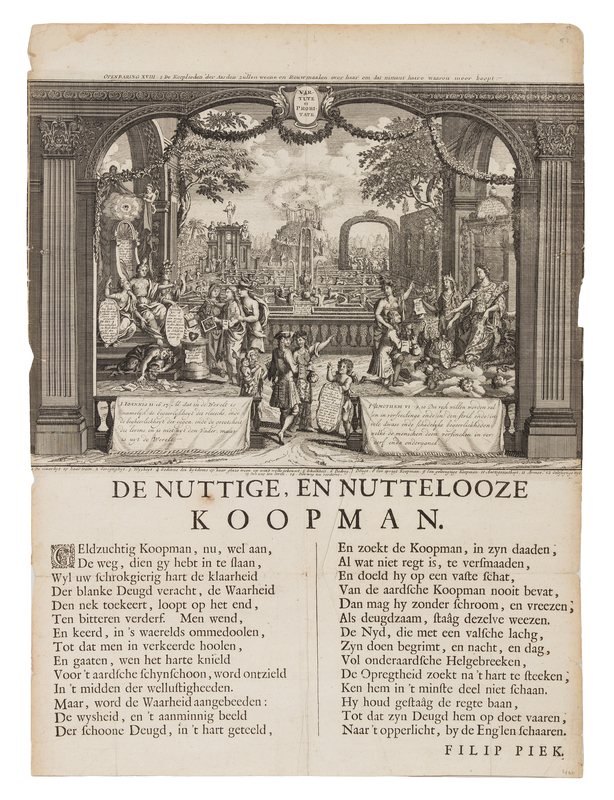[Het Groote Tafereel der Dwaasheid Amsterdam: D. Onder de Linden, ca 1720.]A group of 28 engravings from Het Groote Tafereel, comprising: 17 folding plates (399/401 x 365/458 mm sheets), 3 single-sheet engraved plates (348/400 x 250/244 mm sheets), 8 engraved vignettes with letterpress text (400/400 x 250/319 mm sheets). Double-page views include: Ruined Shareholders Restored ("De vervallen Actionisten, hersteld, door den Triompheerden Arlequin"), Ruin of the Stockbrokers ("Open Ondergang der Actieonisten het Thuilleriece Hof Quinquempoix"); They Became Crazy because they Believed in Schemes ("By veele zit de kei in't hooft om dat men in de wind gelooft"). A fine set of plates from this vulgar and biting satire on the Mississippi and South Sea Bubbles, the first banking crash. "This great Theatre of Folly is an exceedingly curious collection of emblematical plates and caricatures on the scheme of J. Law and the Mississippi Company and the imitations of it in Holland, with their fatal resultsThe engravings, which illustrate the rise and fall of the great speculation, are full of humor; many of them are exceedingly ludicrous, and some very obscene. They are finely engraved on copper, and are accompanied with full descriptions in prose and poetry" (see Sabin 28932). Complete list available on request.