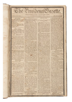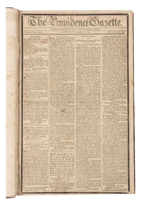The Providence Gazette. Volumes XXXVII-XXXVIII, Nos. 1879-1982. Providence, RI: John Carter, 1800-1801. Folio (443 x 84 mm). Contemporary half roan, marbled boards (worn); wooden slipcase. A COMPLETE RUN from January 1800-December 1801. January 4, 11, and 18 numbers printed with a dark black mourning border, detailing memorial services for Washington in Rhode Island and elsewhere.