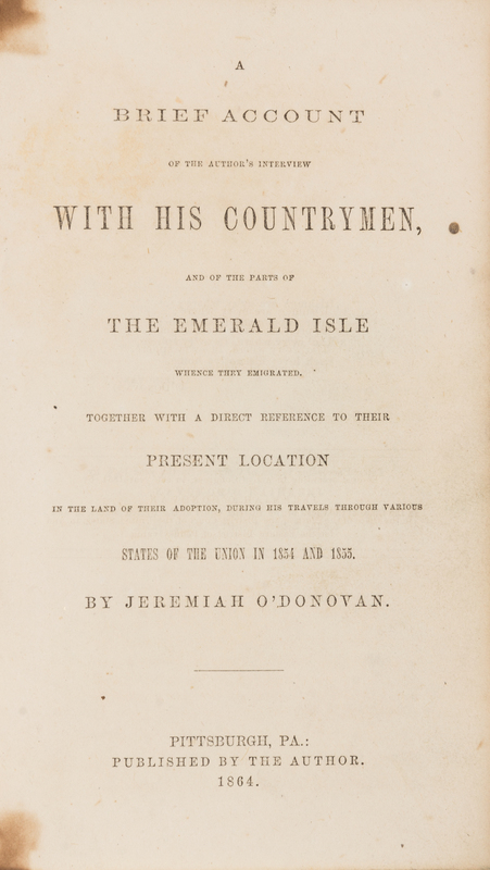 A Brief Account of the Author's Interview with his Countrymen, and of the Parts of the Emerald Isle. Pittsburgh: Published by the Author, 1864.8vo (184 x 111 mm). (A few pale stains.) Contemporary quarter brown calf, marbled boards (some overall wear). FIRST EDITION of O'Donovan's work discussing the social and economic conditions of Irish immigrants in the United States, and recounting O'Donovan's travels as a book salesman in the Ohio valley. RARE at auction. Howes O-24.