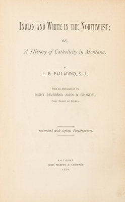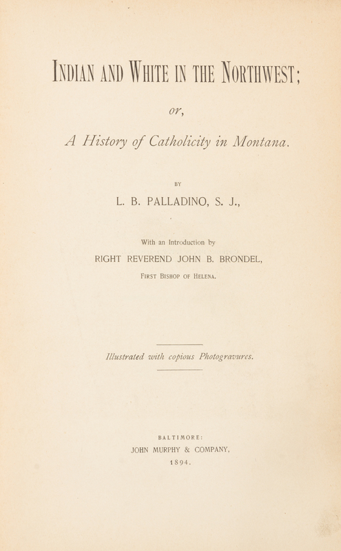 Indian and White in the Northwest; or, A History of Catholicity in Montana. Baltimore: John Murphy & Company, 1894. 8vo. Frontispiece portrait, numerous plates, folding map of Montana. Publisher's blue cloth (manuscript label on spine). FIRST EDITION, a "history of all [Catholic] missions in the region - among the Blackfeet, Piegans, Cheyennes and Crows, and in the white settlements of Montana" (Howes). Howes P-40.
