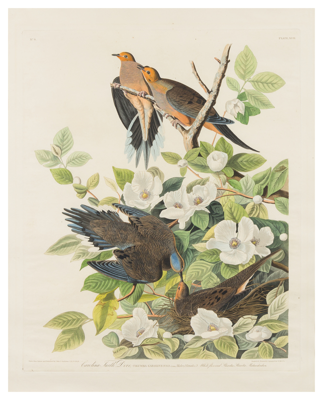 Carolina Turtle Dove (Plate XVII)Columba CarolinensisHand-colored engraving with aquatint and etching, on J Whatman Turkey Mill paper dated 1833, plate 680 x 520 mm (998 x 678 mm sheet), a few short marginal tears repaired on verso, light mat burn, matted and framed. Low Variant 2.