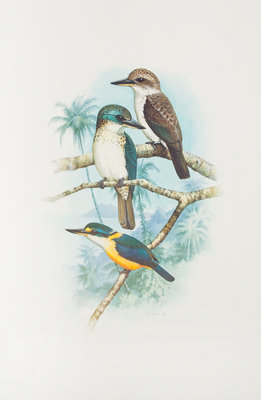 Kingfishers and Related Birds. Sydney: Lansdowne Editions, 1983-1994. Copy 70 of 1,000 copies, signed by Forshaw and Cooper in each volume.Folio. (50.5 x 35 cm) The complete set of six volumes, original vari-colored three-quarters morocco gilt, cloth sides, housed in three cloth drop-back boxes with morocco labels to lids and spines. I, II: 564 pp. with 52 color plates; III: 315 pp., 26 color plates; IV: 251 pp., 22 color plates; V, VI: 437 pp. including 56 color plates.