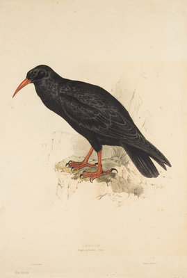 Chough. Fregilis graculus.Hand-colored lithograph, (544 x 370 mm sheet), 1833, a few pale spots or browning, a few short marginal tears repaired on verso. According to Sitwell, Lear was "perhaps the best of all bird painters."