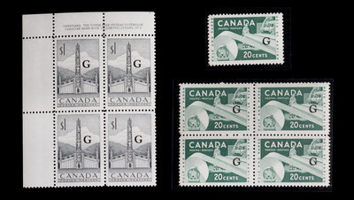 A Single and a Block of Four Canada 1956 Pulp & Paper: Flying 'G' Overprint 20-Cent Stamps