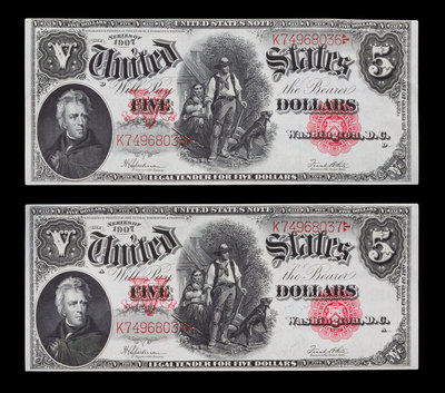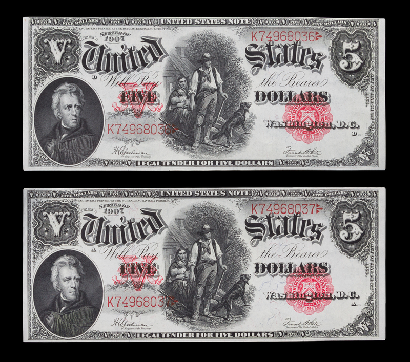 Two United States 1907 $5 Legal Tender Notes