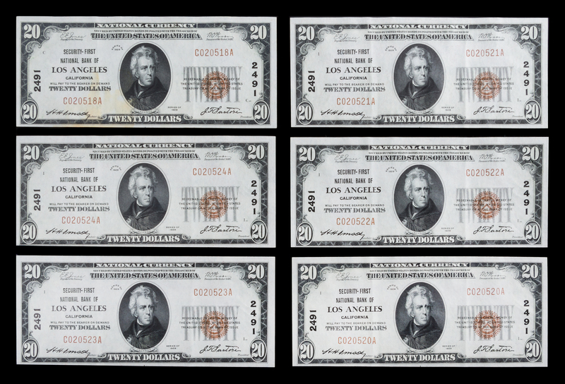 A Group of Six United States 1929 Type-1 $20 National Bank Notes