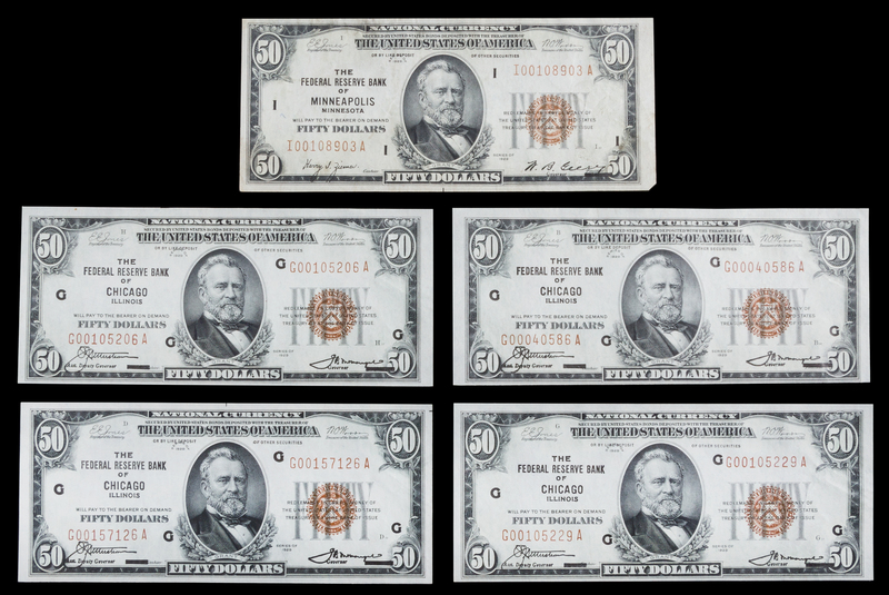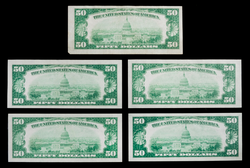 Five United States 1929 $50 Federal Reserve Bank Notes