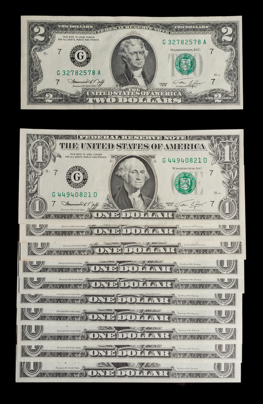 each series with sequential serial numbers, together with a series 1976 $2 FRBN.