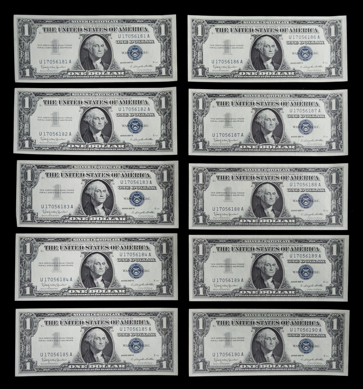A Group of Ten Sequential United States 1957B $1 Silver Certificates