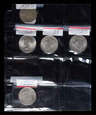 A Group of Five United States Peace Silver Dollars
