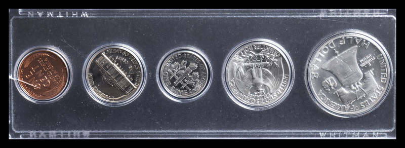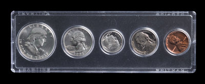 comprising a Franklin Half-Dollar, Washington quarter, Roosevelt dime, Jefferson nickel and a Lincoln wheat-back penny in a clear lucite case.