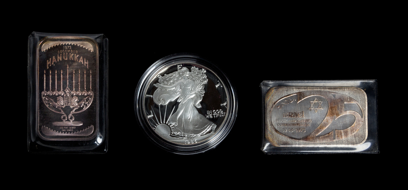 comprising a 1986 United States Silver Eagle Cameo Proof and two 1-ounce silver bars.
