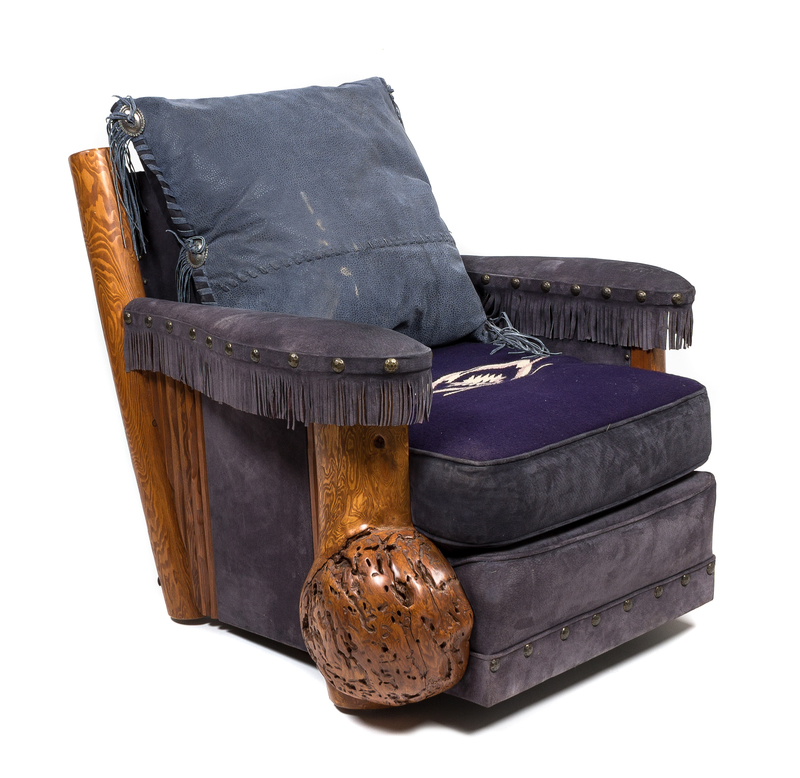 upholstered in navy leather, corduroy, fringe and loose back pillow.