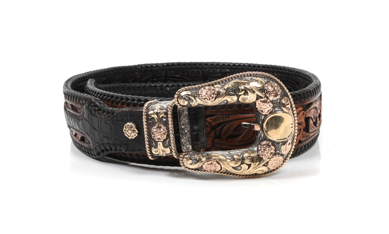 on a reversible tooled brown and black leather belt with floral and foliate design. Featuring 14k rose gold flowers, 14k yellow gold scrolls, a 2 color twisted rope edge, and a 14k yellow gold shield. #01/01.