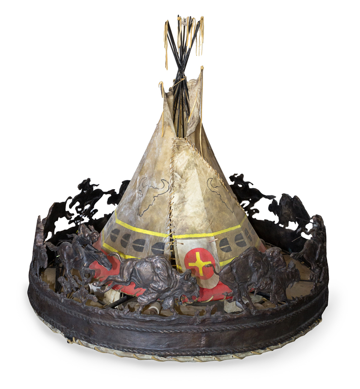 central polychrome hide teepee encased by bronze Indians in profile hunting buffalo above sold rim with rope decoration, lower hide diffuser, eight lights, signed to exterior of rim Peter M Fillerup, 1992.
