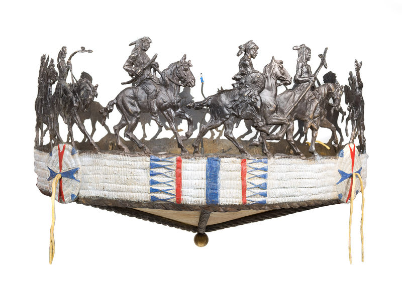 depicting Native Americans in profile on horseback above colored blanket strip banding.