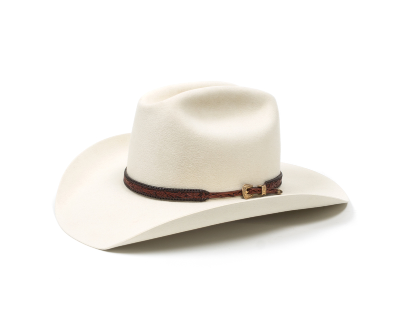 bone color with tooled leather and ranger set hat band, 20X Platinum.