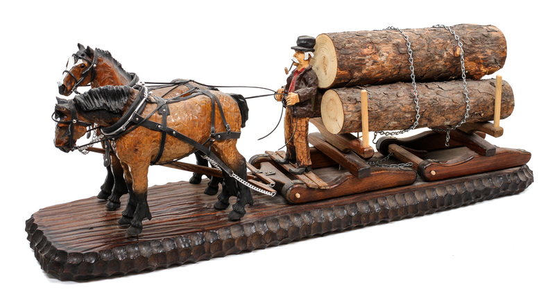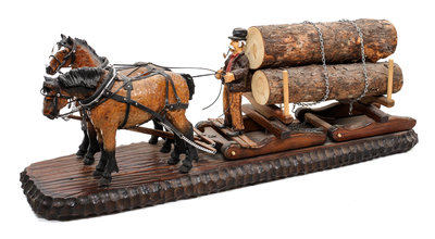 A Carved Wood Sculpture Depicting Draft Horses Pulling a Logging Sled and Driver.