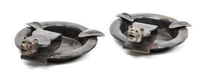 Two Wrought Iron Ash Tray with Attached Bear Motif Match Box Holders