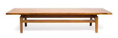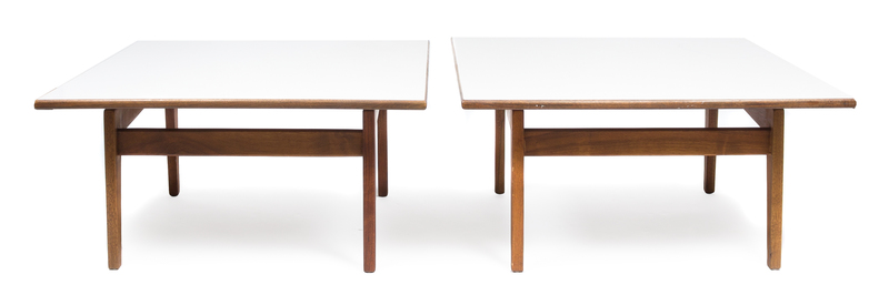 the first of elongated rectangular form together with two square laminate top end tables with walnut legs and stretchers, Jens Risom Design label.