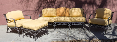 comprised of two three seat sofas, a 48 diameter circular table, an ottoman, three arm chairs and cushions.