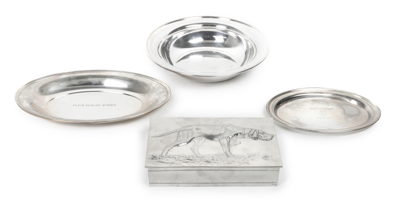 gilded interior, un-monogrammed cartouche with Greek key border and handles in the form of stag heads with antlers, together with two oval silver plate trays, the smaller engraved Men's Stag Day, June 23, 1961 and the larger engraved Plain Dealer Winner together with a Portuguese box, lid depicting a hound dog.