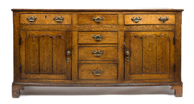 having a three plank top over three drawers above three central drawers flanked by two cupboard doors, raised on plinth base with bracket feet.