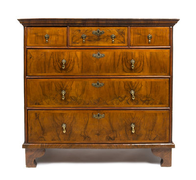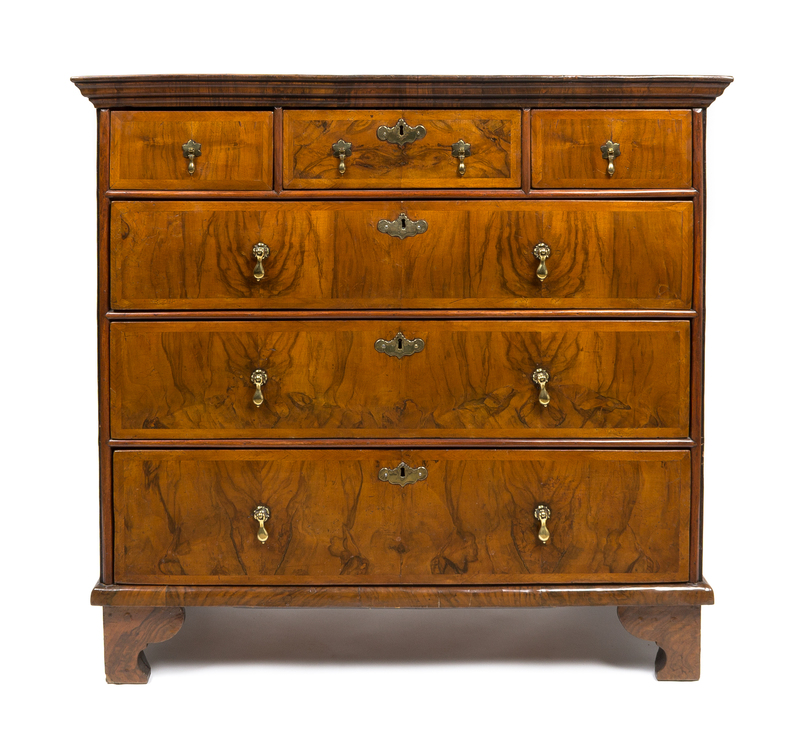 rectangular molded top over three short drawers and three graduated long drawers raised on bracket feet, secondary wood is oak.