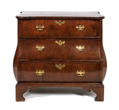 having stylized rectangular top above bombe shaped body containing three conforming drawers all on base with stylized plinth feet.