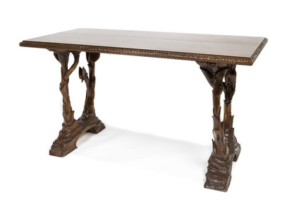 each with rectangular tops with carved edges over two branch form conjoined legs, one table features butterflies, the other birds.