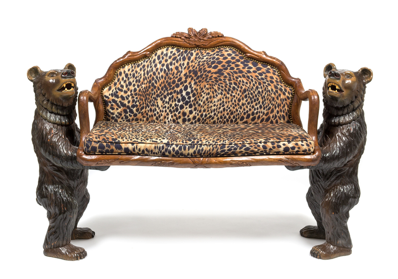 bench carved with oak leaves on crest rail flanked by two standing carved and painted bear figures, seat and back upholstered in leopard print fabric.