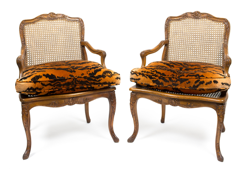 acanthus leaf carving at crest rail, arms and side rails, caned back and seat over carved cabriole legs, leopard patterned upholstered seat cushions.