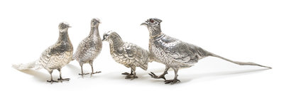 a pair of male and female partridges with movable wings together with two other partridges, a male with glass eyes, total weight 38 Troy ounces.